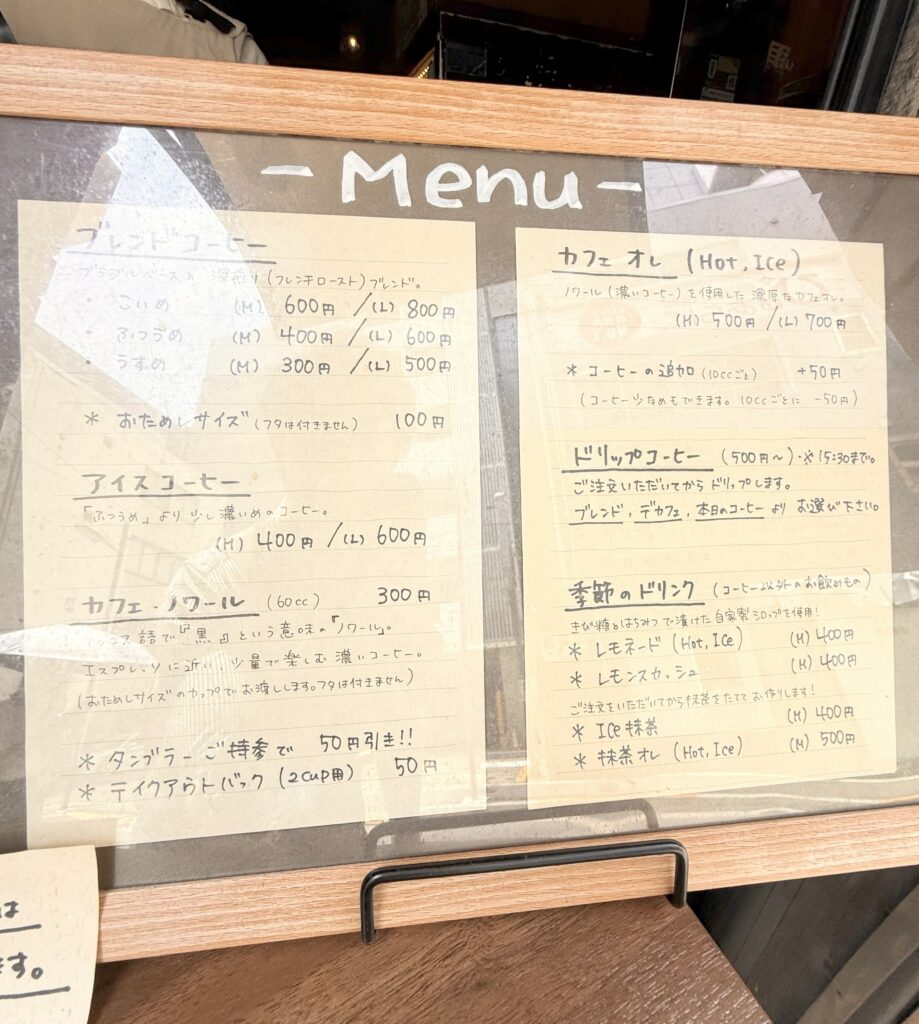 ブレンドコーヒーは¥300~、カフェオレは¥500、抹茶オレは¥500、レモネード¥400などなど。
