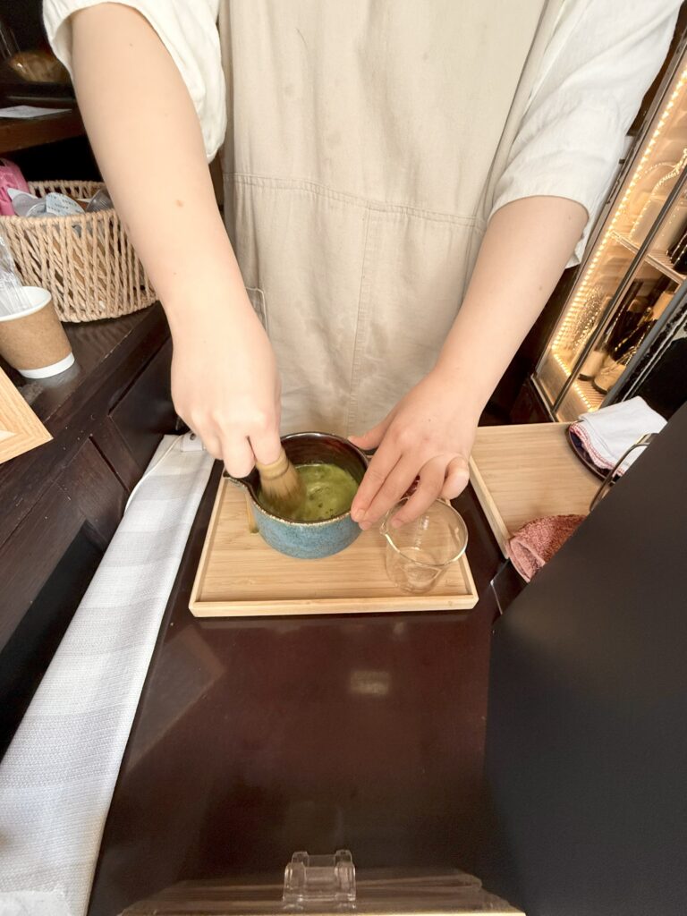 抹茶オレはお抹茶を茶せんで点てて作られています。コーヒーはハンドドリップ、レモネードは